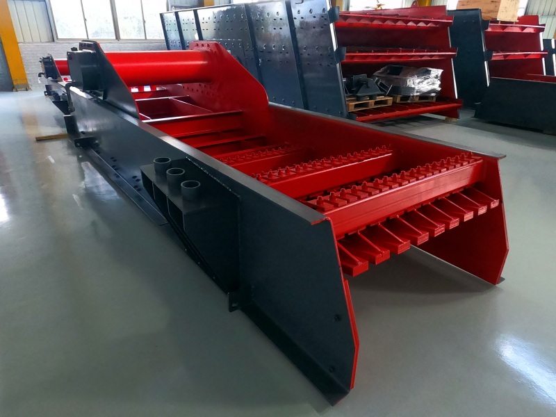该系列给料机,由于在接近排料端的给料面布有分级作用缝隙可调的棒条,所以在进行给料同时能将物料中泥土及细碎粒级的物料分离出去,使其后面的破碎机更有效发挥功能;该系列给料机采用消化引进美国枝术制造的振动器、框架式环槽铆钉联接结构.又采用锰钢制造的护板和棒条,结构坚固、强度高、耐冲击、耐磨损。