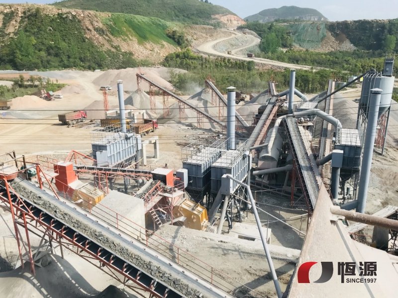 开采的石头先由振动给料机送料给颚式破碎机进行初步破碎,二级破碎由圆锥破完成,圆锥破出来的物料上振动筛进行筛分,大于40mm的物料返回圆锥破重新破碎,形成闭路循环,小于40mm的物料进入立式冲击破进行整形破碎。立式冲击破出来的物料上成品筛进行筛分,大于20mm的返回立式冲击破循环破碎,小于20mm的物料经皮带机输送至各个成品料堆。